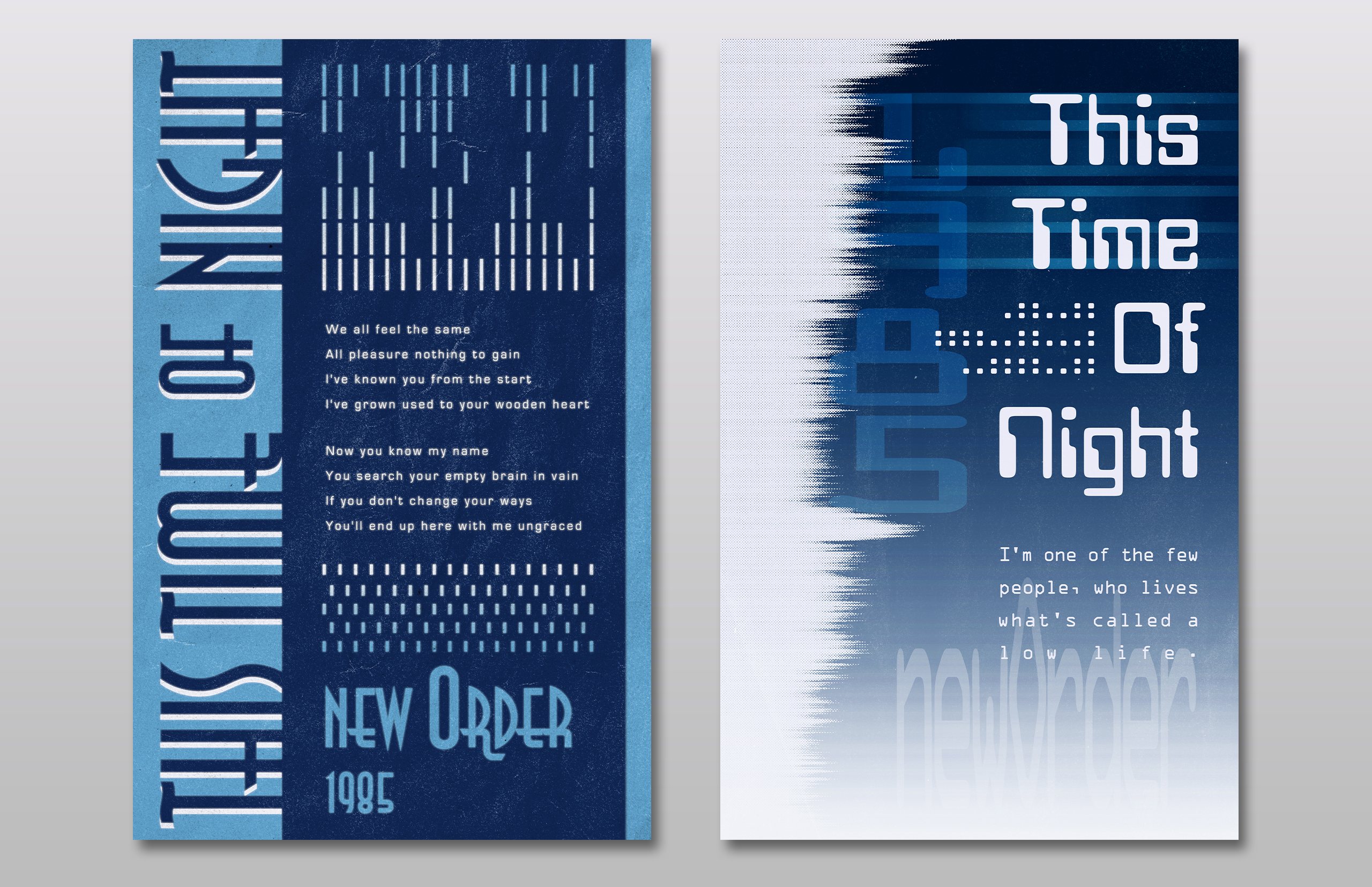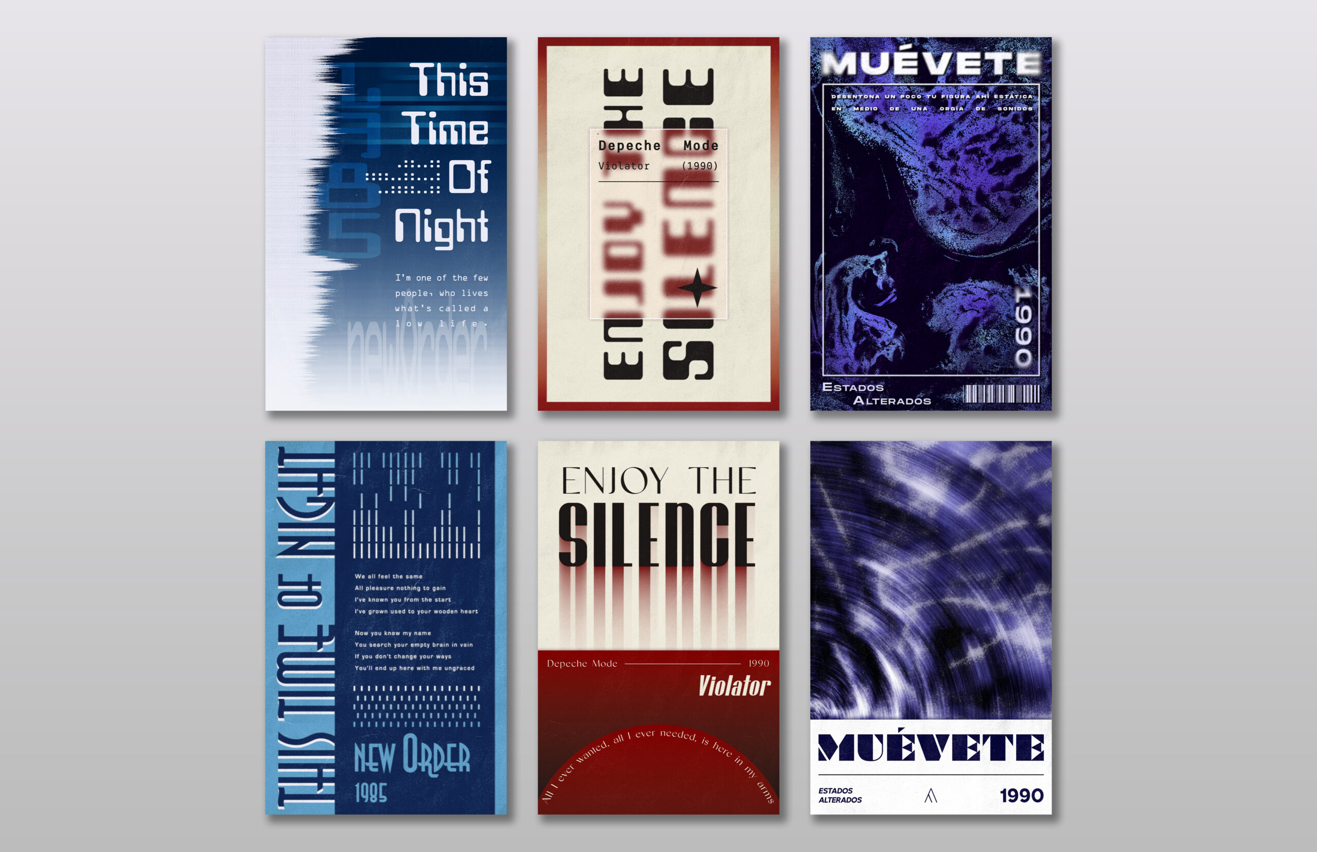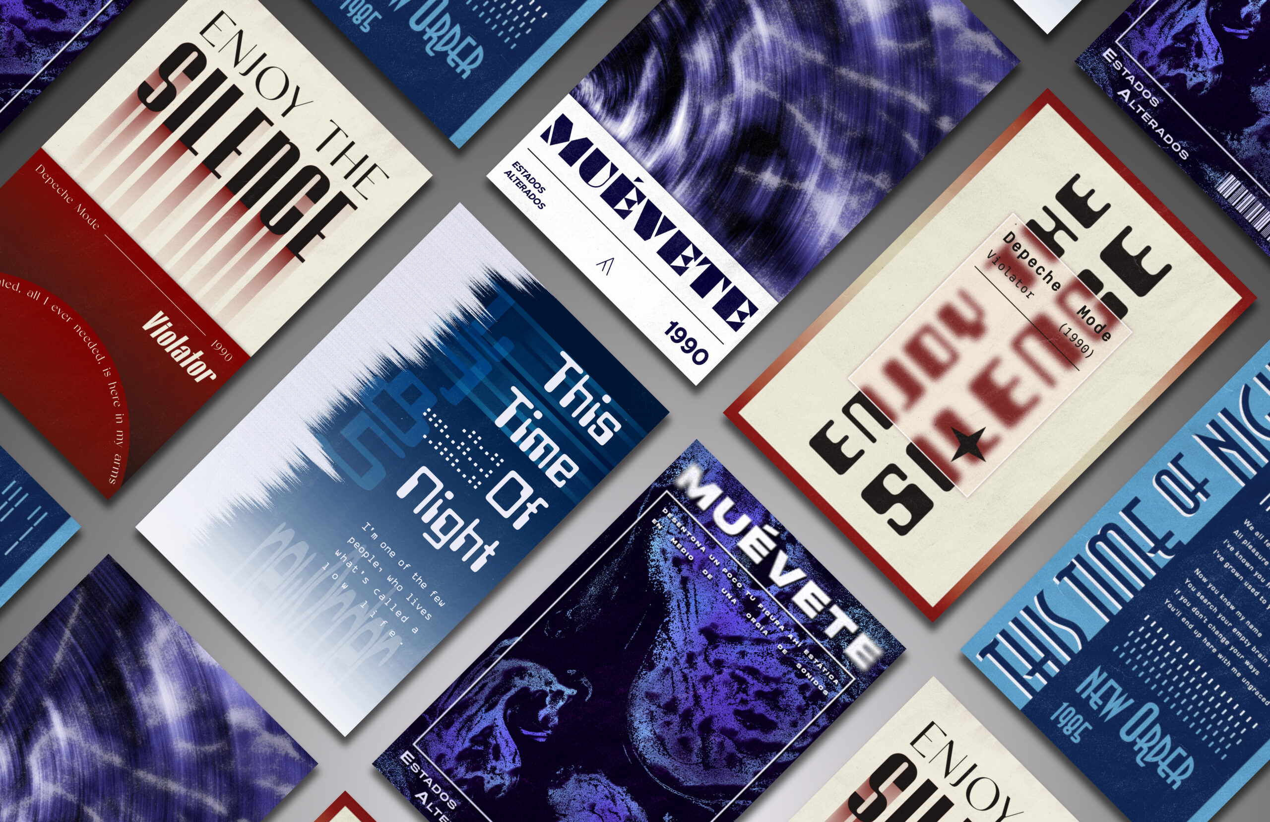 Este proyecto reúne una serie de afiches tipográficos basados en canciones que influyen en mi proceso creativo. Exploro texturas, contrastes y composiciones experimentales para evocar el ambiente emocional de cada tema trabajando únicamente con gráfica y tipografía. La serie incluye interpretaciones de Enjoy the Silence, Muévete y This Time of Night, cada una desarrollada desde dos enfoques visuales distintos.
