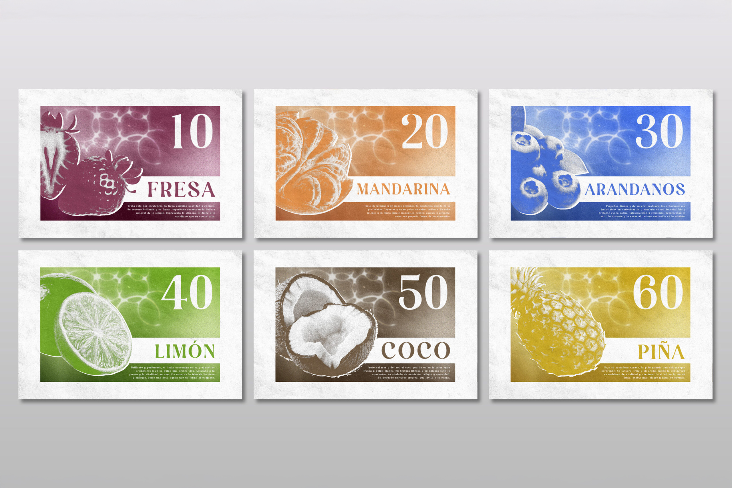 Esta serie de postales explora seis frutas a través de composiciones monocromáticas que imitan la estética de la impresión artesanal. Cada pieza combina tramas, texturas y efectos de desgaste para evocar procesos como la serigrafía o el risograph, creando un acabado táctil y nostálgico. El proyecto busca reinterpretar elementos cotidianos desde un lenguaje gráfico simple, vibrante y altamente sensorial.